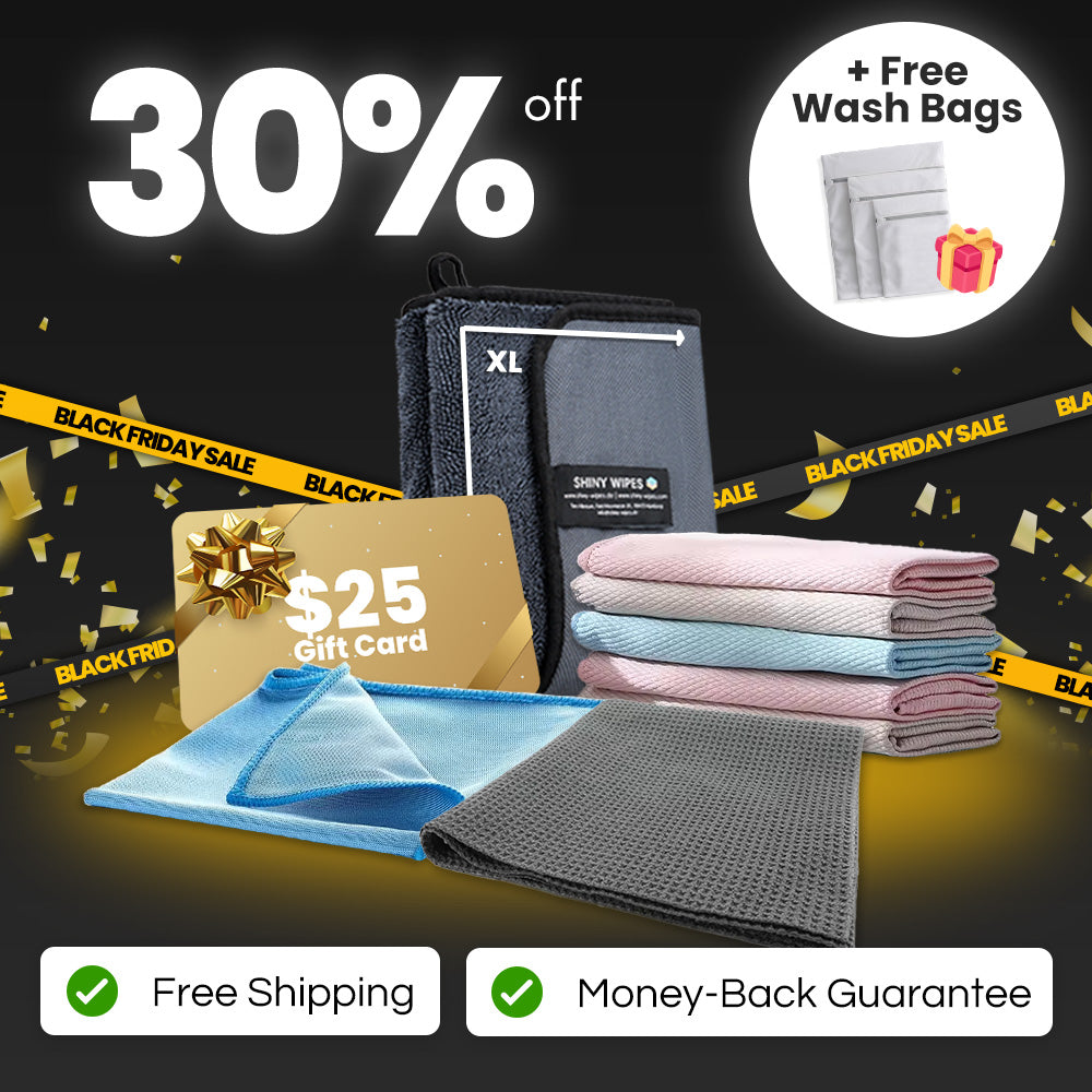 Everything you need to clean, dry, and polish your home to a sparkling shine. The Dry & Shine Bundle includes our Shiny Bath™ XL Drying Towel, a set of 5 All-Purpose Cloths, the XL Window Cloth, and the Glass Polishing Cloth - plus a $25 USD Shiny Wipes™ gift card! Get 30% off compared to buying individually, plus enjoy free shipping, a 30-day money-back guarantee, and a free set of washing bags to keep your cloths in top shape.