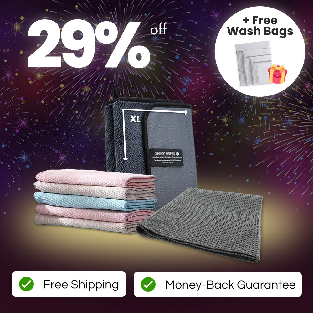 Everything you need for a spotless, streak-free shower without the hassle! The Spotless Shower Bundle includes our bestselling Shiny Bath™ XL Drying Towel, a set of 5 Shiny Wipes™ All-Purpose Cloths, and the XL Window Cloth for crystal-clear glass. Get 29% off compared to buying individually, plus enjoy free shipping, a 30-day money-back guarantee, and a free set of washing bags to keep your cloths in top shape.